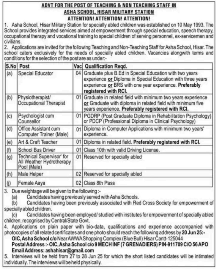 Complete information related to this Bharti 2025 is available on the haryanakhabri.com Other more Information Like age limit, eligibility, selection procedure and other information are mention in this article. Asha School Military Station Hisar Vacancy
