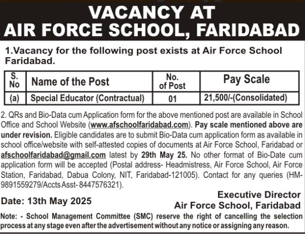 Important Information :- Airforce Faridabad School Vacancy : The Air-force School FARIDABAD, Haryana is Informed you that Application have been sought for the selection of Special Educator Post on Contract Basis. The Application Starting Date for this vacancy is 13 May 2025. The Last Date for this vacancy is 29 May 2025.
