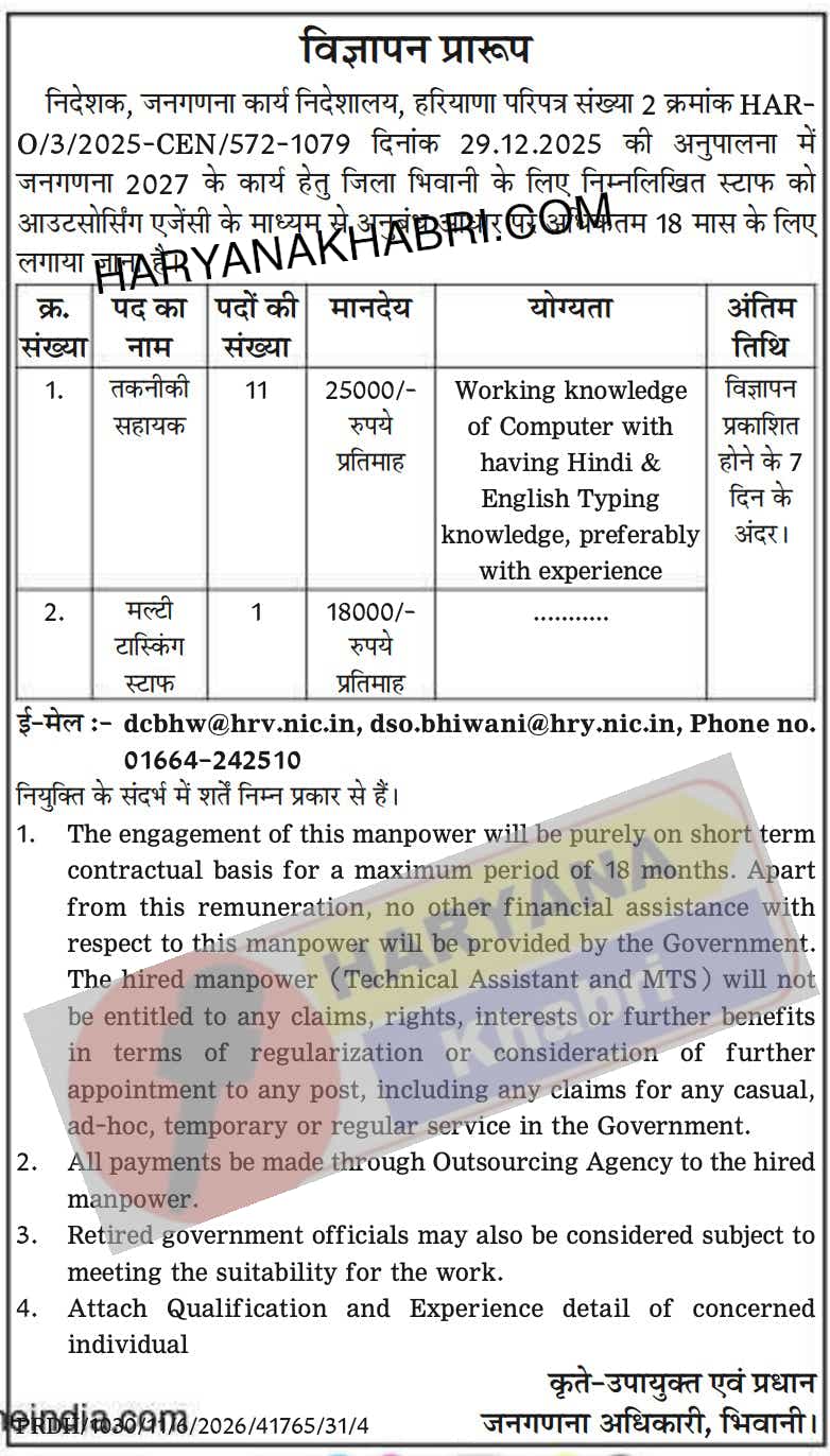 Important Information :- Bhiwani Census Department Vacancy : Haryana Census Operations Directorate, BHIWANI is Informed or Notify you that Application have been sought for 12 Posts of Technical Assistant & MTS under Contract/Regular Basis. The Application Starting Date for all Eligible Candidates is 06.01.2026. The last date for submission of Vacancy applications is 12.01.2026. Information Related to this Bharti/Recruitment is Given Below.