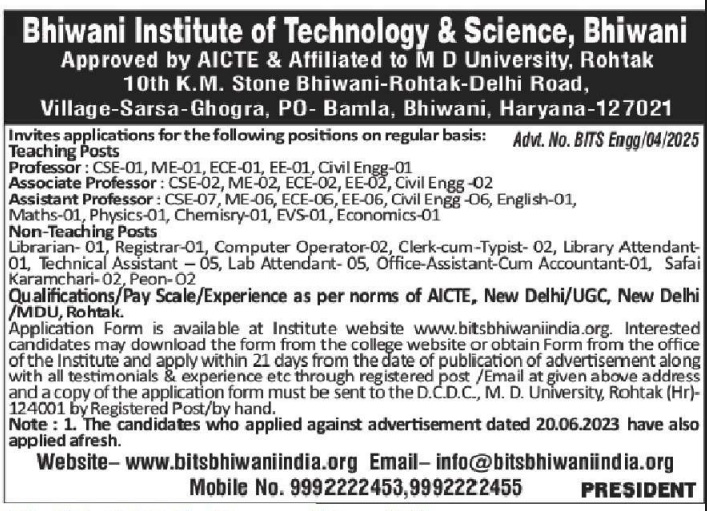 - Now Submit duly filled in application form along with educational/technical qualifications to “Bhiwani Institute of Technology & Science, Bhiwani,10th K.M. Stone Bhiwani-Rohtak-Delhi Road, Village-Sarsa-Ghogra, PO- Bamla, Bhiwani, Haryana-127021.”