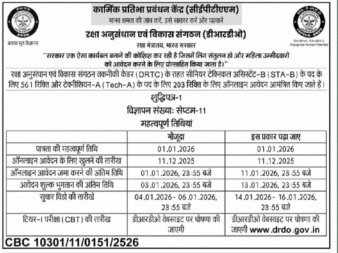 Important Information :- DRDO CEPTAM 11 STA and Technician Recruitment 2025 : The DRDO Centre For Personal Talent Management (CEPTAM) is Informed or Notify you that Application have been sought for 764 Various Senior Technical Assistant-B (STA-B) and Technician-A (Tech-A) through the CEPTAM-11 Examination in all over India. The Application Starting Date for all Eligible Candidates is 11 December 2025. The last date for submission of this Vacancy applications is 11 January 2026. Information Related to this Bharti/Recruitment is Given Below.
