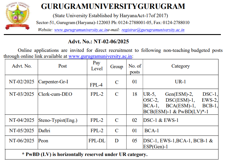 Gurugram University Non-Teaching Recruitment 2025 – Notification Released, Advt. NT-02-06/2025