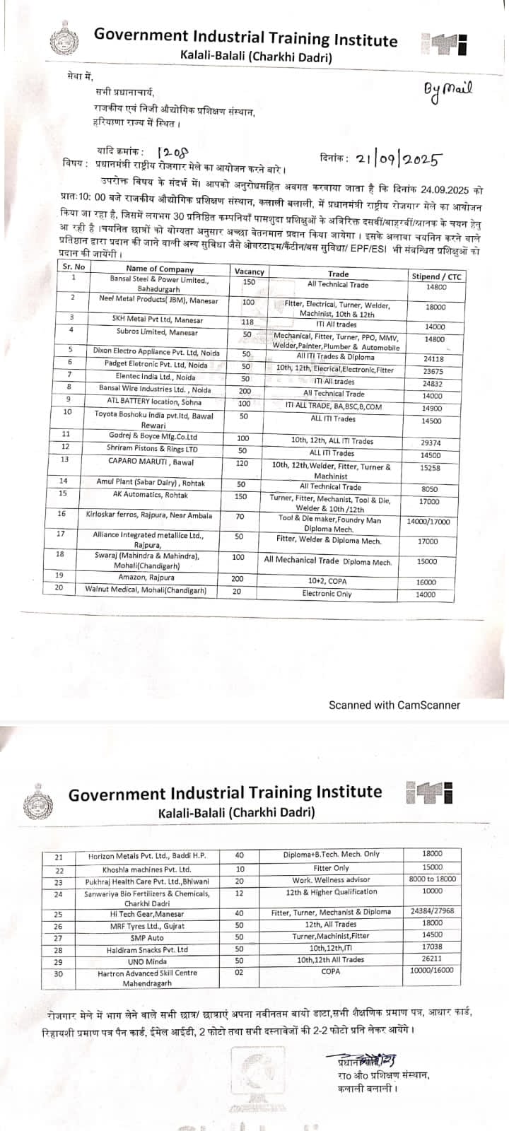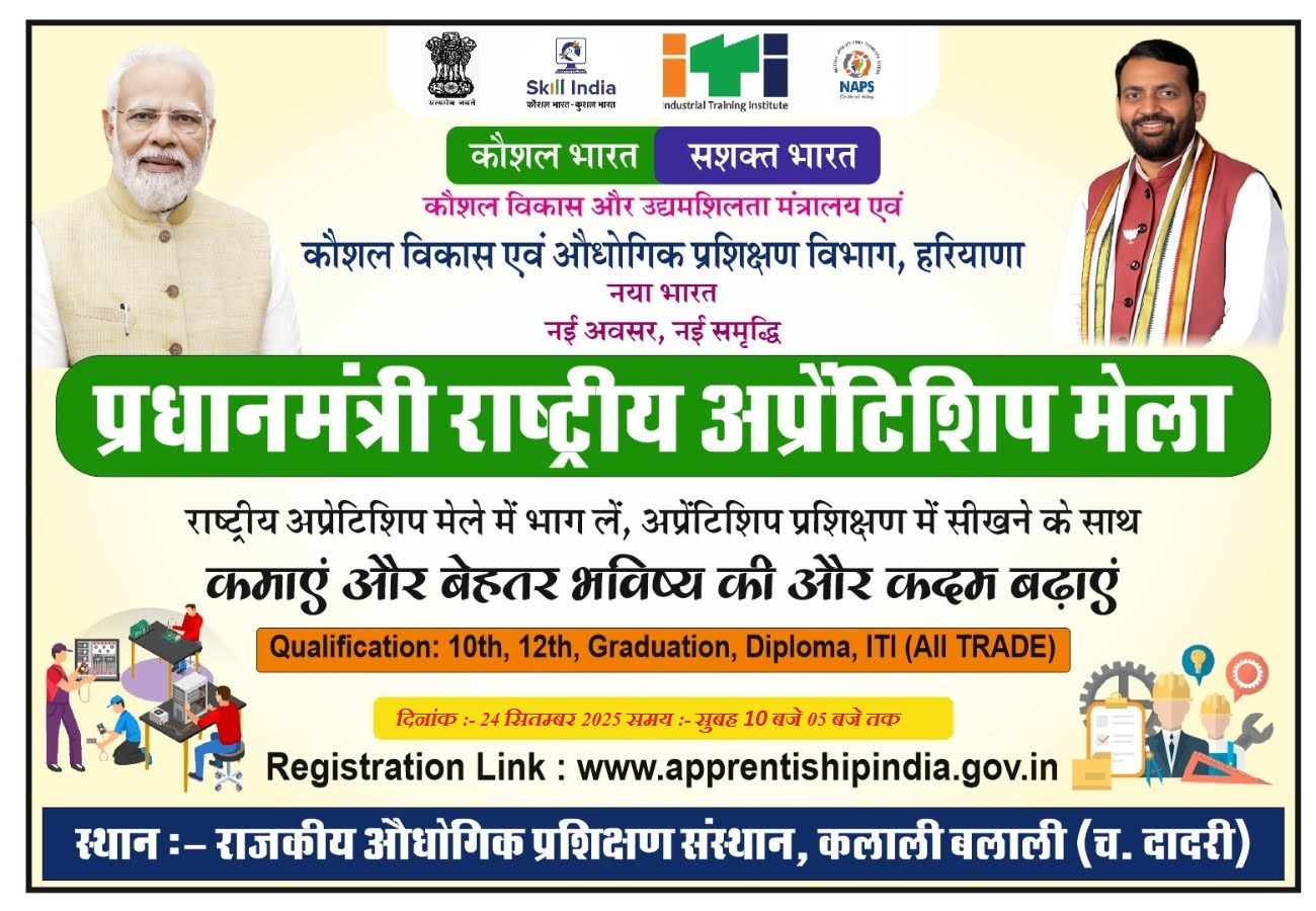 Important Information :- Haryana Job Fair Vacancy 2025 : Prime Minister National Apprenticeship Mela (PMNAM) is Informed you that Application have been sought for 2152 10th, 12th, Graduation, Diploma, ITI pass candidates for Apprenticeship opportunities OR Pre Placement Offer under various departments, boards, corporations, and offices of the Haryana Government OR Private Companies. More than 30 Companies are Participate in this Job Fair. This is Walk in Interview Job. No Need to Apply Online or Offline. Interested Candidates can Reach at Govt. ITI KALALI-BALALI, CHARKHI DADRI on dated 24.09.2025. As Per Notification of this vacancy, Other Information Related to this Bharti/Recruitment is Given Below.