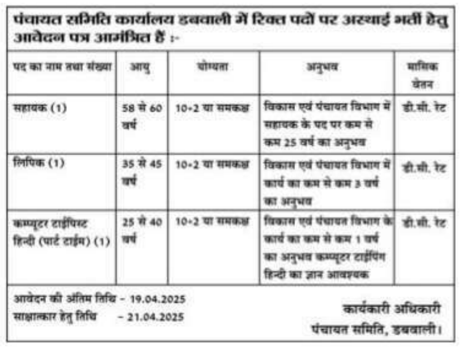- Interview Date : 21 April 2025 at Office of Executive Officer, Panchayat Samiti – Dabwali, Sirsa.