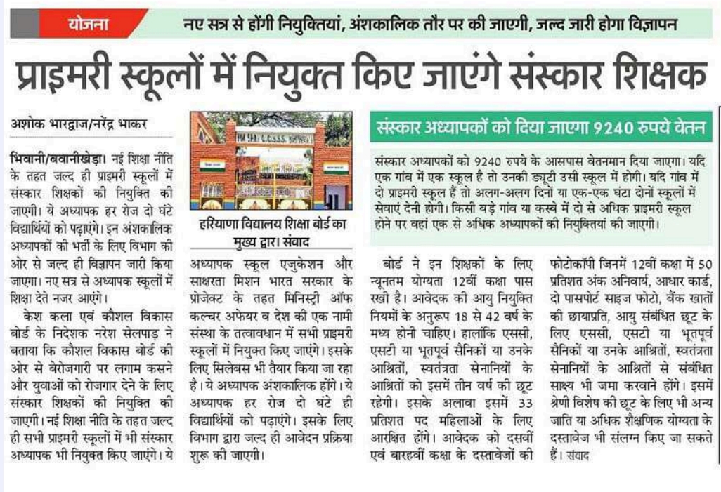 Complete information related to this Bharti 2025 is available on the haryanakhabri.com Other more Information Like age limit, eligibility, selection procedure and other information are mention in this article. Haryana Sanskar Teacher Recruitment