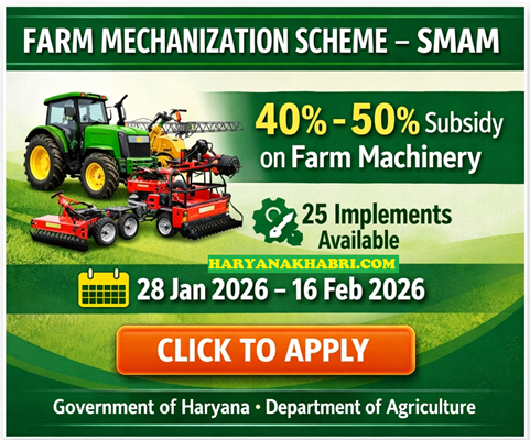 पंचकुला स्थित कृषि एवं किसान कल्याण विभाग ने कृषि यंत्रीकरण (एसएमएएम) योजना के लिए एक अधिसूचना जारी की है। इच्छुक एवं पात्र उम्मीदवार 28.01.2026 से ऑनलाइन फॉर्म भर सकते हैं। ट्रैक्टर सब्सिडी आवेदन जमा करने की अंतिम तिथि 16.02.2026 है। यह हरियाणा एसएमएएम मशीन योजना का हिस्सा है।