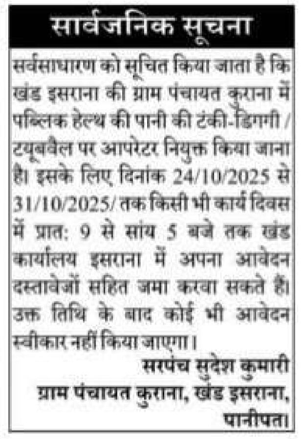 Important Information :- Haryana Tubewell Operator Vacancy : Block Development and Panchayat Office (BDPO), ISRANA, District PANIPAT is Informed or Notify you that Application have been sought for Tube-well Operator Posts under Contract/Regular Basis in various Villages of Respective Blocks. The Application Starting Date for all Eligible Candidates is 24 October 2025. The last date for submission of Vacancy applications is 31 October 2025. Information Related to this Bharti/Recruitment is Given Below.