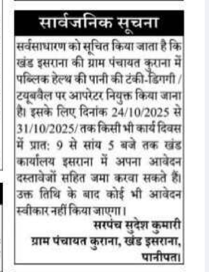 Important Information :- Haryana Tubewell Operator Vacancy : Block Development and Panchayat Office (BDPO), ISRANA, District PANIPAT is Informed or Notify you that Application have been sought for Tube-well Operator Posts under Contract/Regular Basis in various Villages of Respective Blocks. The Application Starting Date for all Eligible Candidates is 24 October 2025. The last date for submission of Vacancy applications is 31 October 2025. Information Related to this Bharti/Recruitment is Given Below.