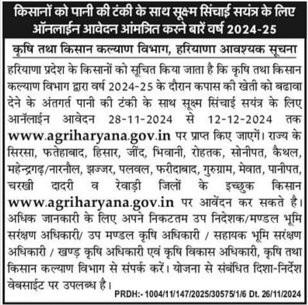 हरियाणा प्रदेश के किसानों को सूचित किया जाता है कि कृषि तथा किसान कल्याण विभाग द्वारा वर्ष 2024-25 के दौरान कपास की खेती को बढावा देने के अंतगर्त पानी की टंकी के साथ सूक्ष्म सिंचाई सयंत्र के लिए आनलाईन आवेदन 28-11-2024 से 12-12-2024 तक www.agriharyana.gov.in पर प्राप्त किए जाएगें। राज्य के सिरसा, फतेहाबाद, हिसार, जींद, भिवानी, रोहतक, सोनीपत, कैथल, महेन्द्रगढ़/नारनौल, झज्जर, पलवल, फरीदाबाद, गुरुग्राम, मेवात, पानीपत, चरखी दादरी व रेवाड़ी जिलों के इच्छुक किसान www.agriharyana.gov.in पर आवेंदन कर सकते है।