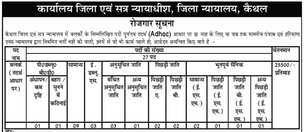 Complete information related to this Bharti 2025 is available on the haryanakhabri.com Other more Information Like age limit, eligibility, selection procedure and other information are mention in this article. Kaithal District Court Recruitment