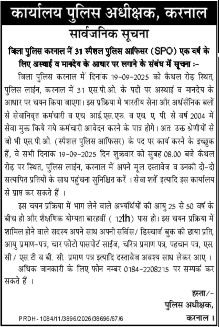 Important Information :- Karnal Police SPO Vacancy : Haryana Police Department, KARNAL is Informed or Notify you that Application have been sought for 31 SPO (Special Police Officer) post. This is only Walk in Interview Job. Direct Walk in Interview Date is 19.09.2025.