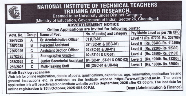 Important Information :- NITTTR Chandigarh Recruitment 2025 : National Institute of Technical Teachers Training and Research (NITTTR), Chandigarh is Informed or Notify you that Application have been sought for various Group A, B, and C posts. The Application Starting Date for all Eligible Candidates is 09.09.2025. The last date for submission of various Vacancy applications is 15.10.2025. Information Related to this Bharti/Recruitment is Given Below.