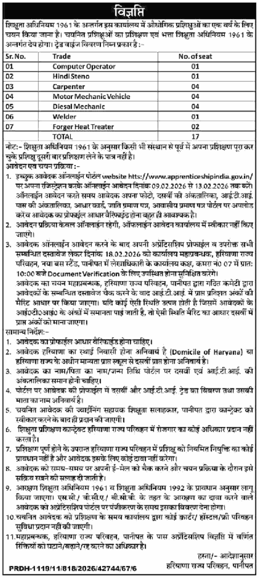 Important Information :- Panipat Roadways Recruitment 2026 : Ministry of Skill Development And Entrepreneurship is Informed or Notify you that Application have been sought for 17 Various posts for PANIPAT Bus Depot. The Application Starting Date for all Eligible Candidates is 09.02.2026. The last date for submission of various Vacancy applications is 13.02.2026. Information Related to this Bharti/Recruitment is Given Below.