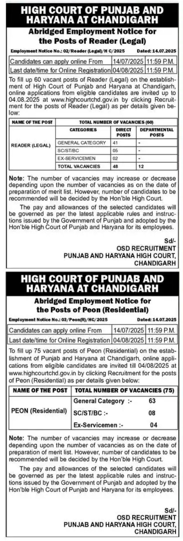 Important Information :- Punjab Haryana High Court Bharti 2025 : HIGH COURT OF PUNJAB AND HARYANA AT CHANDIGARH is Informed or Notify you that Online Application have been sought for Peon (Residential) & Reader (Legal) Post on Regular Basis. The Application Starting Date for all Eligible Candidates is 14 July 2025. The last date for submission of High Court Vacancy applications is 04 August 2025. As Per Notification of this Recruitment 2025, Other Information Related to this Bharti/Recruitment is Given Below.