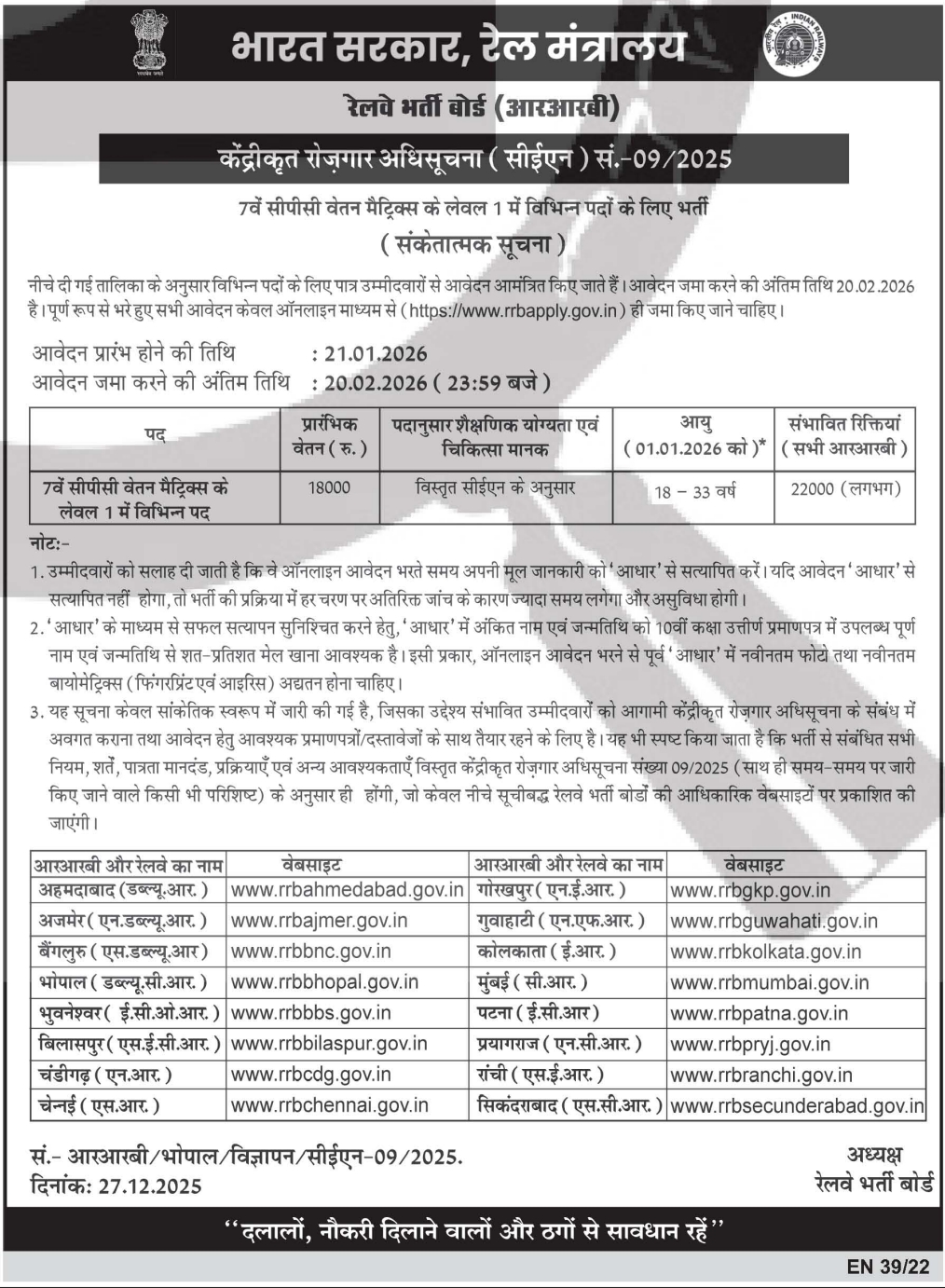 Important Information :- RRB Group D Recruitment 2026 : Railway Recruitment Board (RRB), Ministry of Railways, Government of India is Informed or Notify you that Application have been sought for 22000 Group D Various Post. The Application Starting Date for all Eligible Candidates is 21 January 2026. The last date for submission of Group D Vacancy applications is 20 February 2026.