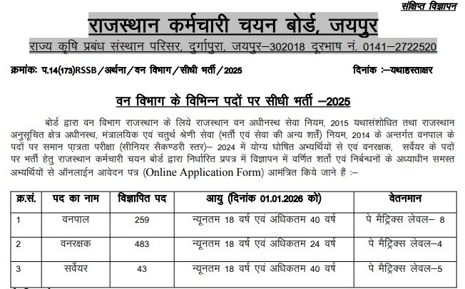 Important Information :- RSSB Forest Guard and Forester Recruitment 2025 : Rajasthan Staff Selection Board (RSSB) is Informed or Notify you that Online Application have been sought for 785 Forest Guard, Forester, and Surveyor Post on Regular Basis. The Application Starting Date for all Eligible Candidates is Update Soon. The last date for submission of this Vacancy applications is Update Soon. As Per Notification of this Recruitment 2025, Other Information Related to this Bharti/Recruitment is Given Below.