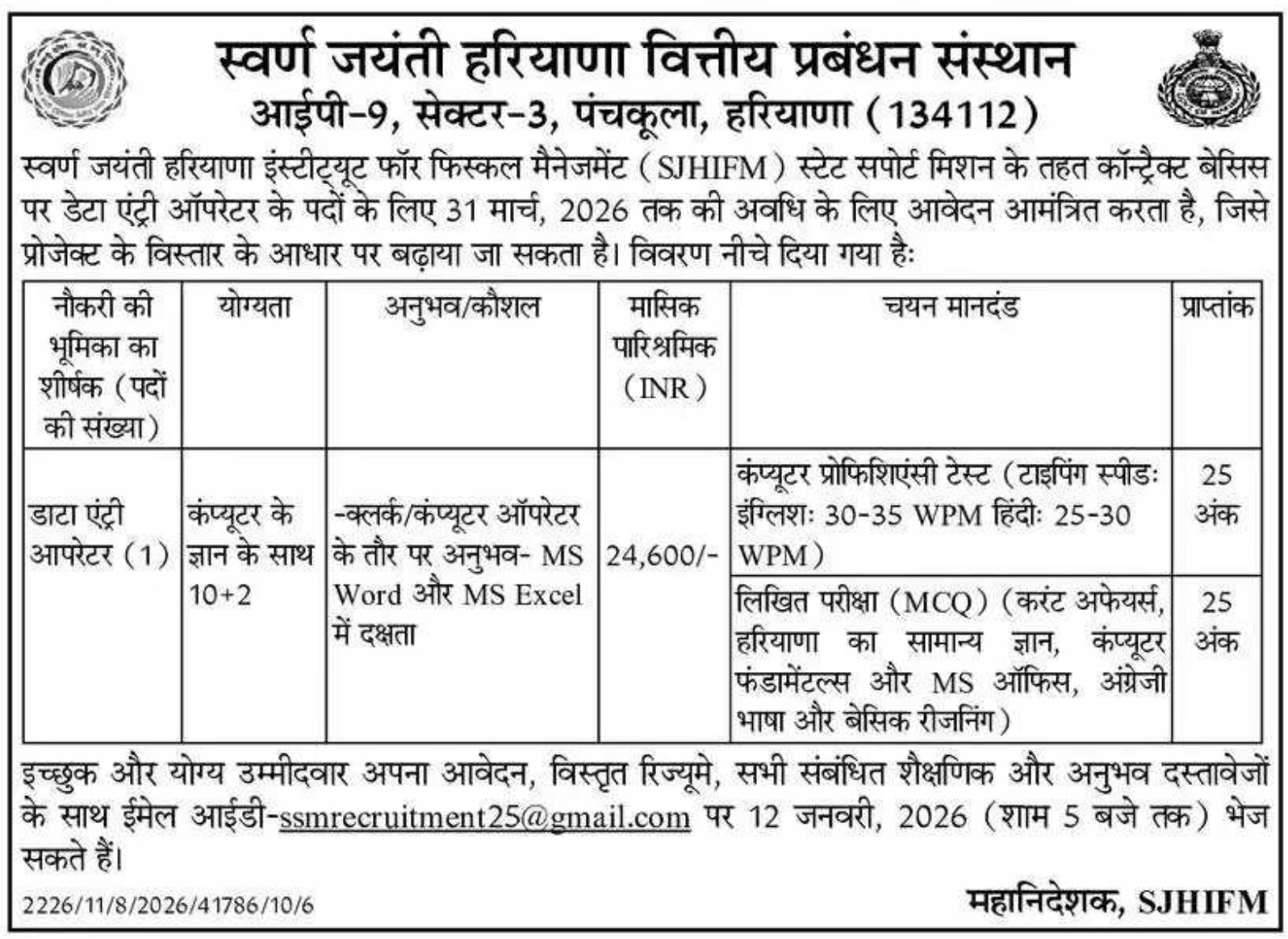 Important Information :- SJHIFM Panchkula Vacancy 2026 : Swarna Jayanti Haryana Institute for Fiscal Management (SJHIFM), Panchkula is Informed or Notify you that Application have been sought for the Posts of Data Entry Operator under Contract Basis. The Application Starting Date for all Eligible Candidates is 07.01.2026. The last date for submission of Vacancy applications is 12.01.2026. Information Related to this Bharti/Recruitment is Given Below.