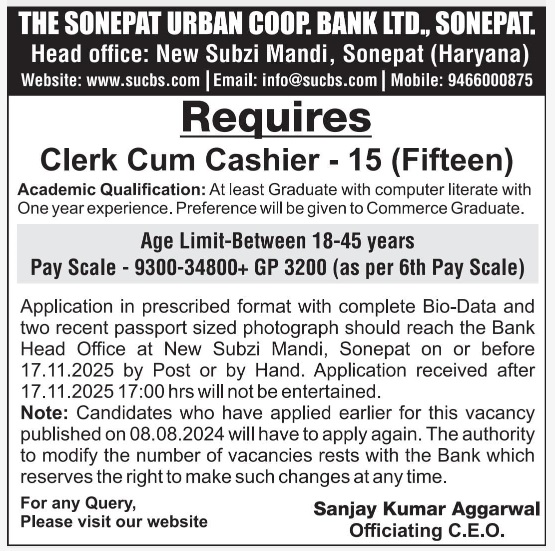 Important Information :- Sonipat Cooperative Bank Vacancy : The Sonepat Urban Co-operative Bank Ltd. Near New Sabzi Mandi Sonepat (Haryana) is Informed or Notify you that Application have been sought for Clerk cum Cashier posts. The Application Starting Date for all Eligible Candidates is 10.11.2025. The last date for submission of Vacancy applications is 17.11.2025. Information Related to this Bharti/Recruitment is Given Below.