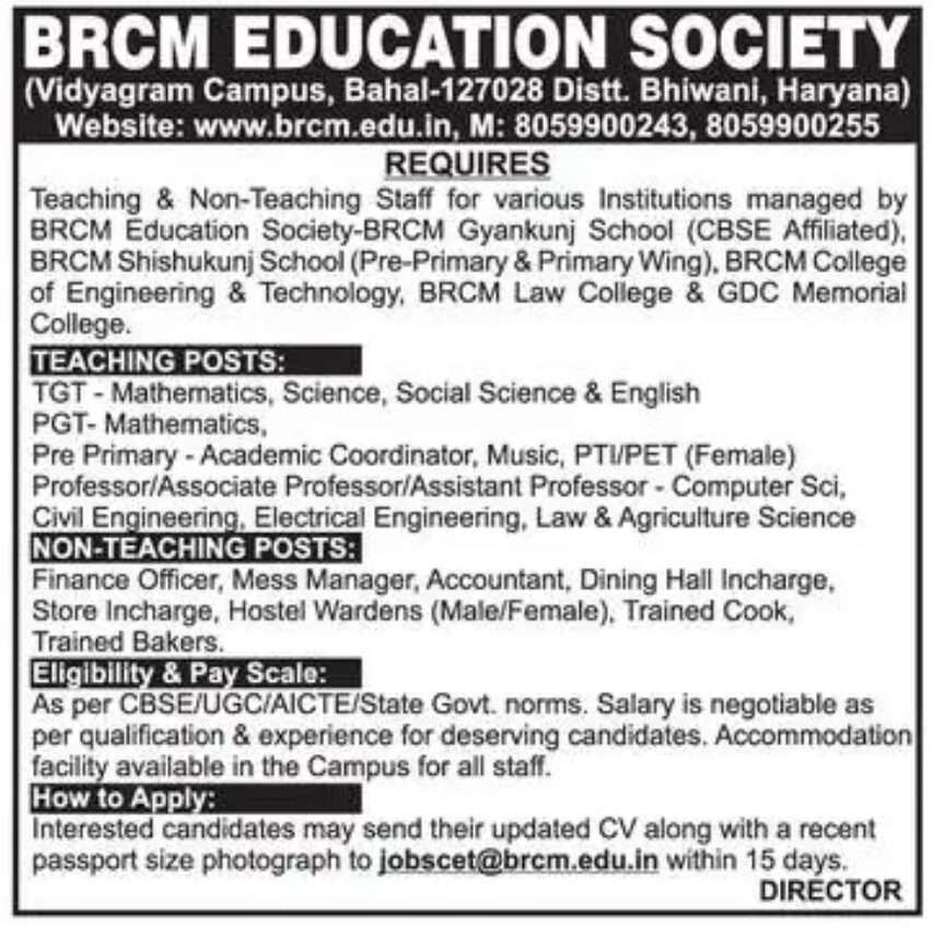 Important Information :- BRCM Education Society Recruitment 2025 : BRCM Education Society, BHIWANI, HARYANA is Informed or Notify you that Application have been sought for Teaching & Non-Teaching posts under Contract Basis. The Application Starting Date for all Eligible Candidates is 22 June 2025. The last date for submission of various Vacancy applications is 06 July 2025. Information Related to this Bharti/Recruitment is Given Below.