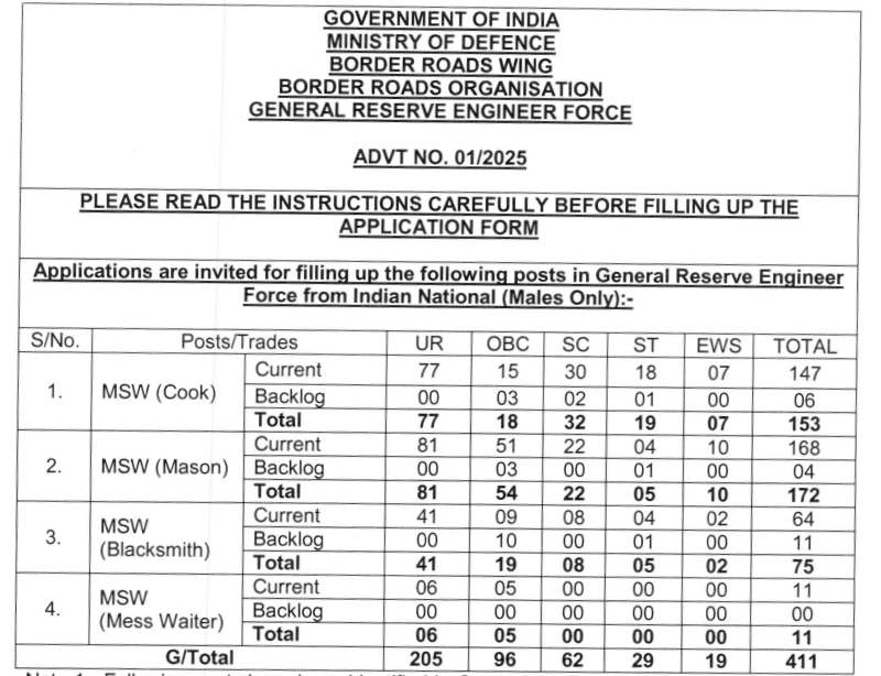 Important Information :- BRO Recruitment Advt 01/2025 : Border Road Organization (BRO), Government of India is Informed or Notify you that Application have been sought for 411 MSW Cook, Mason, Turner, Blacksmith, Mess Waiter Post. The Application Starting Date for all Eligible Candidates is 11 January 2025. The last date for submission of BRO Vacancy applications is 24 February 2025. As Per Notification of BRO GREF Recruitment 2025, Other Information Related to this Bharti/Recruitment is Given Below. Before Applying for this BRO Recruitment, Candidates must be Checked all Essential & Important Information like as Eligibility, Qualification, Age Limit, Fees, Syllabus, Pervious Year Papers (PYP), Exam Date, Admit Card, Result, Final Merit List etc. All Related Information is Available on this Website or Official Website of Recruitment Organization. BRO Recruitment Advt 01/2025