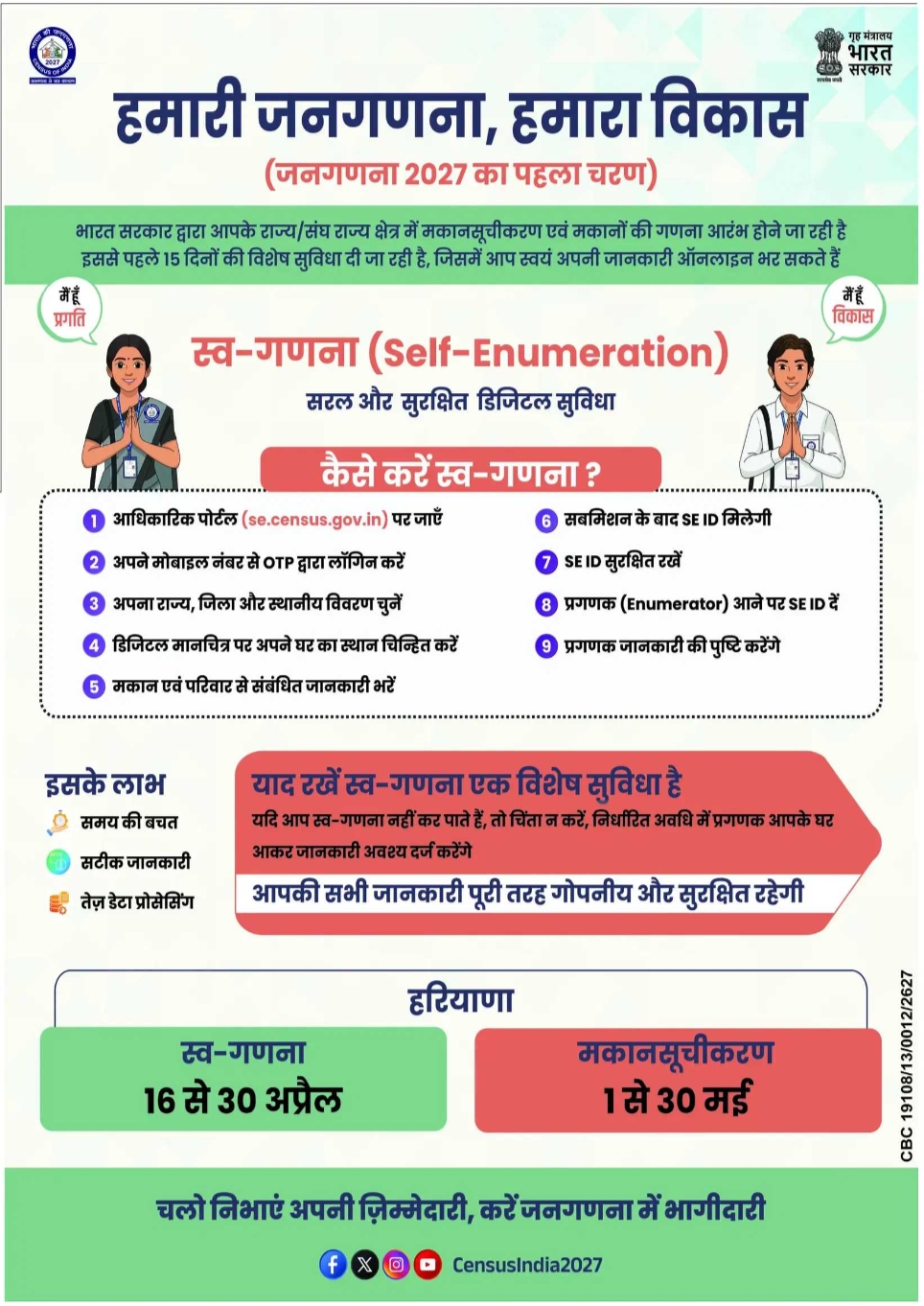 This new facility will begin on April 16th. Self-enumeration will also begin in Haryana, Madhya Pradesh, Andhra Pradesh, Arunachal Pradesh, Chandigarh, and Chhattisgarh from April 16th. House listing and house enumeration will also be conducted in these states from May 1st to May 30th.