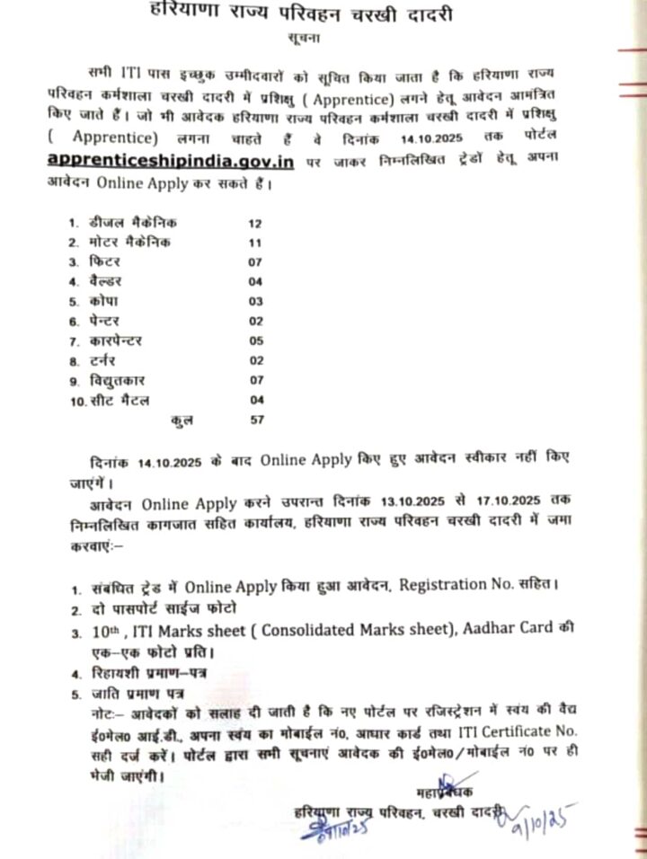 Important Information :- Charkhi Dadri Roadways Recruitment 2025 : Ministry of Skill Development And Entrepreneurship is Informed or Notify you that Application have been sought for Various posts under Apprenticeship. The Application Starting Date for all Eligible Candidates is 09.10.2025. The last date for submission of various Vacancy applications is 14.10.2025. Information Related to this Bharti/Recruitment is Given Below. Before Applying for this Recruitment, Candidates must be Checked all Essential & Important Information like as Eligibility, Qualification, Age Limit, Fees, Syllabus, Pervious Year Papers (PYP), Exam Date, Admit Card, Result, Final Merit List etc. All Related Information is Available on this Website or Official Website of Recruitment Organization. Charkhi Dadri Roadways Recruitment 2025