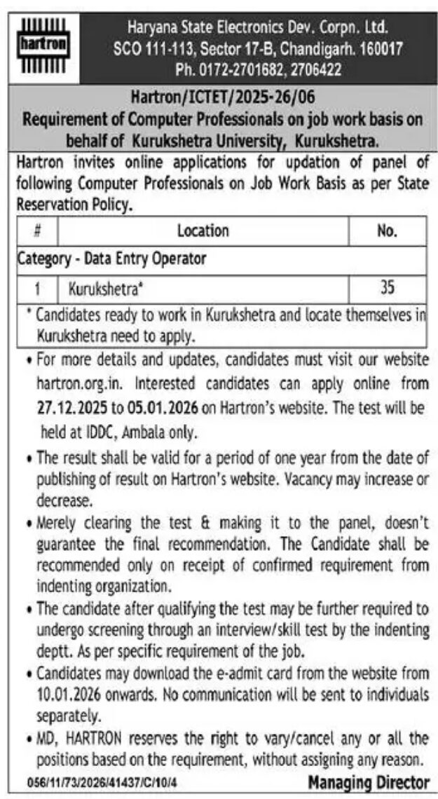 Important Information :- Hartron DEO Vacancy 2025 : Haryana State Electronics Development Corporation Ltd. (Hartron) is Informed or Notify you that Application have been sought for 35 Data Entry Operators (DEO) Post. The Application Starting Date for all Eligible Candidates is 27 December 2025. The last date for submission of Vacancy applications is 05 January 2026. As Per Notification of DEO Vacancy 2025, Other Information Related to this Bharti/Recruitment is Given Below.