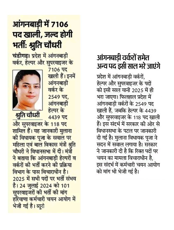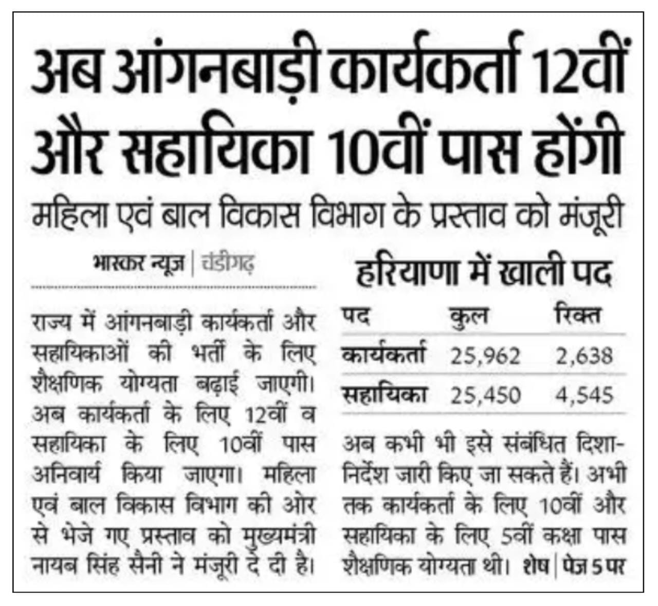 Complete information related to this Bharti 2025 is available on the haryanakhabri.com Other more Information Like age limit, eligibility, selection procedure and other information are mention in this article. Haryana Anganwadi Vacancy 2025