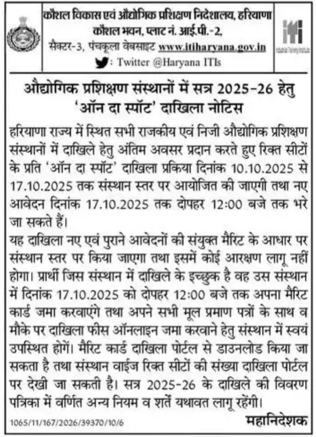 Short Information : Skill Development & Industrial Training Department, Haryana invites applications for Admission in Various NCVT / SCVT trades in Government, Government Aided & Self Financed Trades of ITI (Industrial Training Institute) for Session 2025-26. Department of Skill Development & Industrial Training, HARYANA has Released a Notification for Admission. The Application Starting Date for ITI Admission is 10 OCTOBER 2025 (Open Counselling). The last date for submission of this Admission applications is 17 OCTOBER 2025. The detailed notification for this Admission is released by Department of Skill Development & Industrial Training (SDIT), HARYANA. Haryana ITI Admission 2025