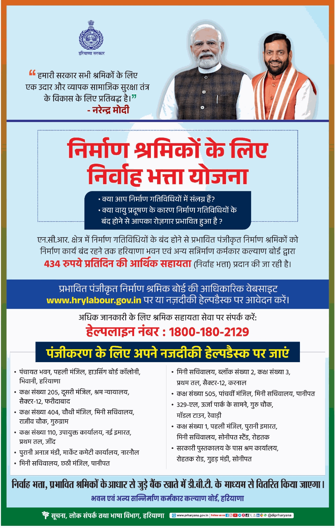 1. श्रमिक हरियाणा भवन एवं अन्य निर्माण श्रमिक कल्याण बोर्ड का पंजीकृत निर्माण श्रमिक होना चाहिए।