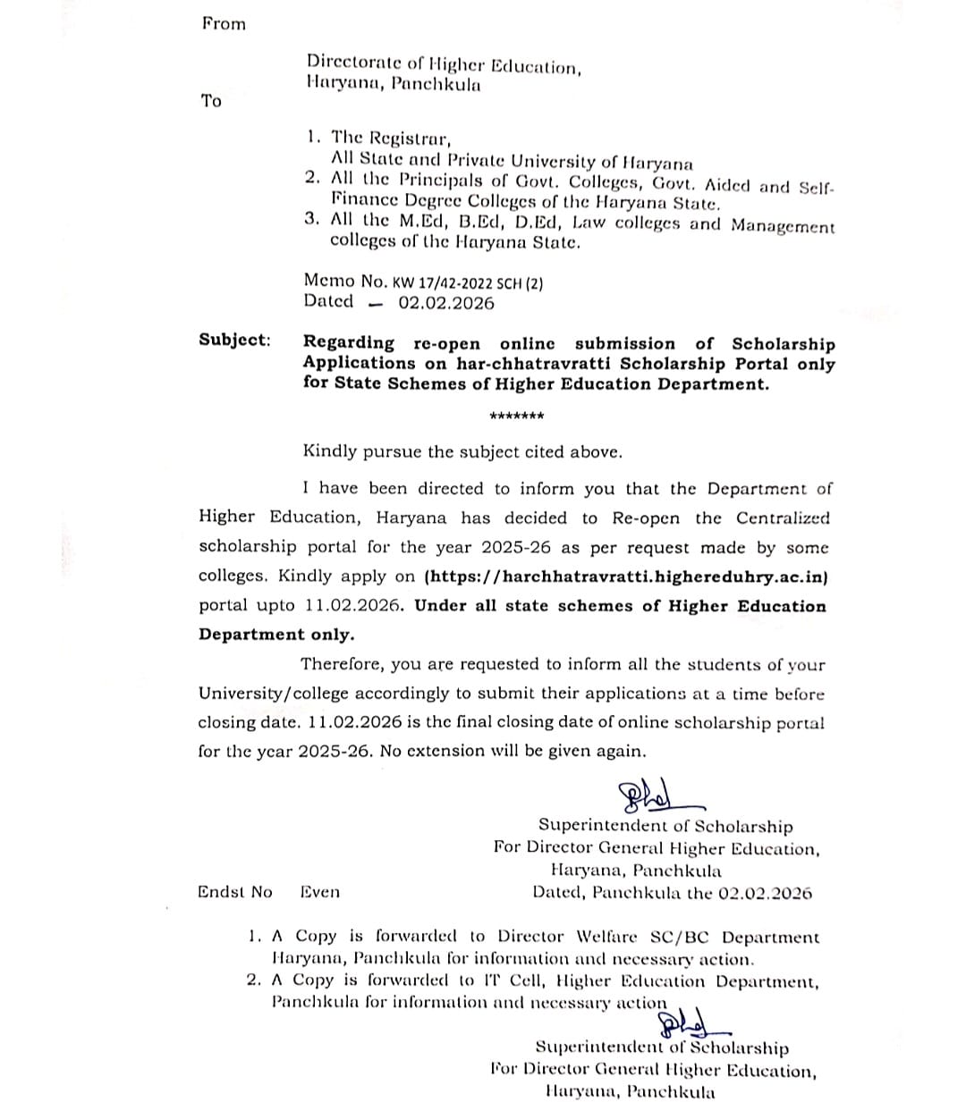 Haryana Post Matric Scholarship Form 2025-26 Notification