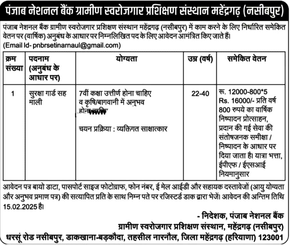 Important Information :- Haryana PNB RSETI Bharti : Punjab National Bank RSETI (Rural Self Employment Training Institute), Mahendragarh is Informed or Notify you that Application have been sought for Security Guard cum Mali posts under Contract Basis. The Application Starting Date for all Eligible Candidates is 25 January 2025. The last date for submission of various Vacancy applications is 14 February 2025. Information Related to this Bharti/Recruitment is Given Below. Before Applying for this Recruitment, Candidates must be Checked all Essential & Important Information like as Eligibility, Qualification, Age Limit, Fees, Syllabus, Pervious Year Papers (PYP), Exam Date, Admit Card, Result, Final Merit List etc.