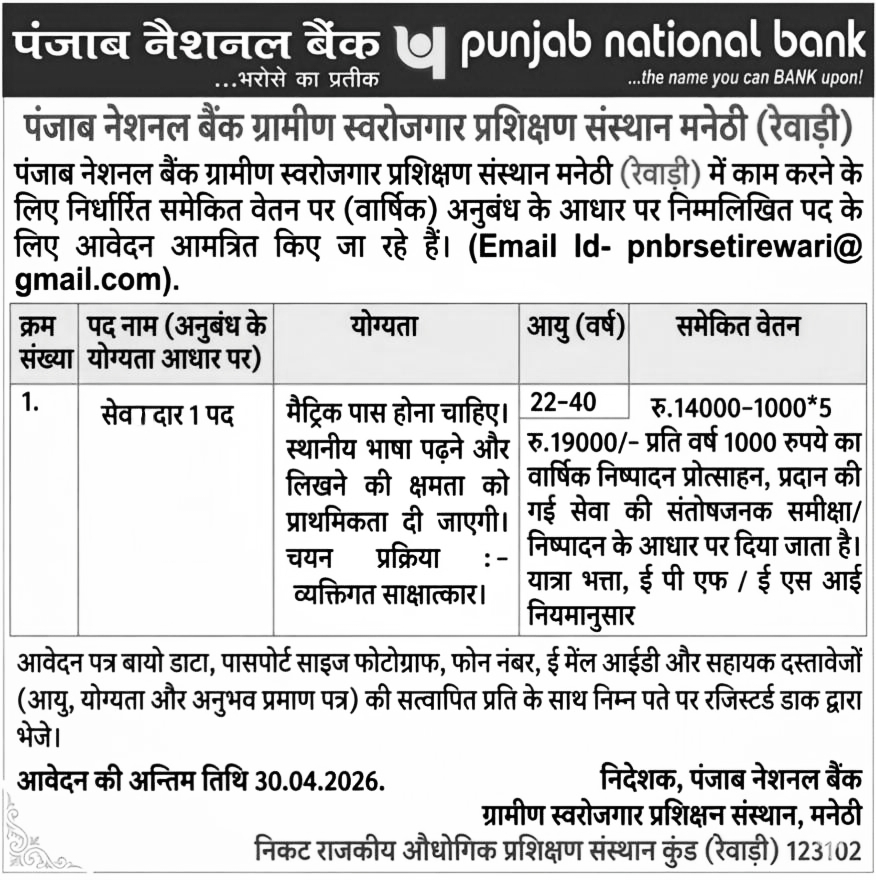Important Information :- Haryana PNB RSETI Bharti 2026 : Punjab National Bank RSETI (Rural Self Employment Training Institute), Manhethi, Rewari is Informed or Notify you that Application have been sought for Peon (सेवादार) posts under Contract Basis. The Application Starting Date for all Eligible Candidates is CHECK BELOW. The last date for submission of various Vacancy applications is CHECK BELOW. Information Related to this Bharti/Recruitment is Given Below. Before Applying for this Recruitment, Candidates must be Checked all Essential & Important Information like as Eligibility, Qualification, Age Limit, Fees, Syllabus, Pervious Year Papers (PYP), Exam Date, Admit Card, Result, Final Merit List etc.