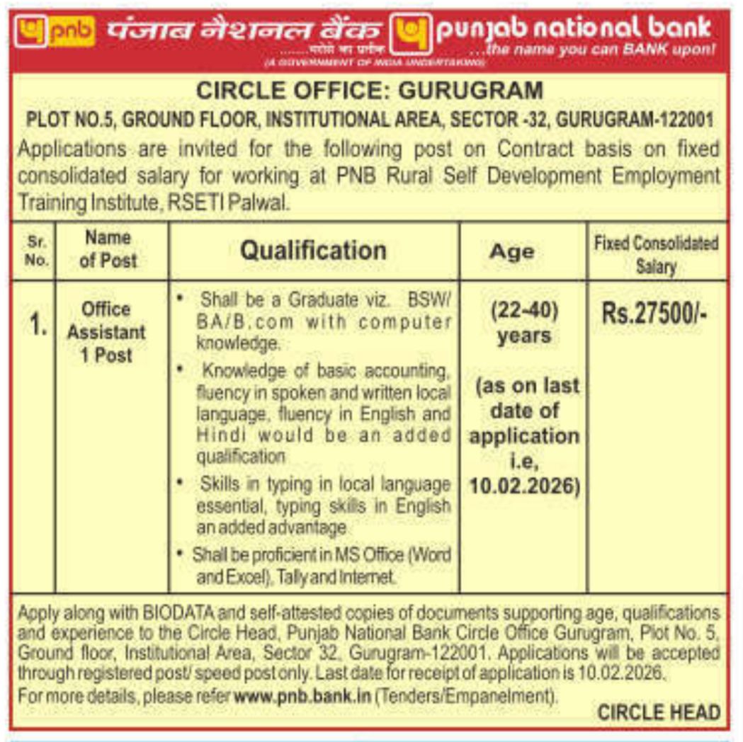 Important Information :- Haryana PNB RSETI Bharti 2026 : Punjab National Bank RSETI (Rural Self Employment Training Institute), GURUGRAM is Informed or Notify you that Application have been sought for Office Assistant posts under Contract Basis. The Application Starting Date for all Eligible Candidates is 24 January 2026. The last date for submission of various Vacancy applications is 10 February 2026. Information Related to this Bharti/Recruitment is Given Below. Before Applying for this Recruitment, Candidates must be Checked all Essential & Important Information like as Eligibility, Qualification, Age Limit, Fees, Syllabus, Pervious Year Papers (PYP), Exam Date, Admit Card, Result, Final Merit List etc.
