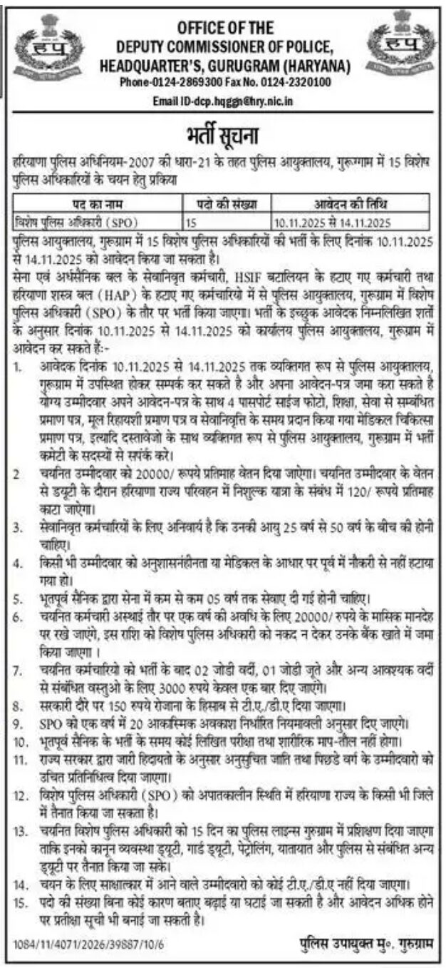 Important Information :- Haryana Police SPO Vacancy : Haryana Police Department, GURUGRAM is Informed or Notify you that Application have been sought for SPO (Special Police Officer) post. The Application Start Date for this form is Check Below District Wise. Last Date of Submission of Form is Check Below District Wise.