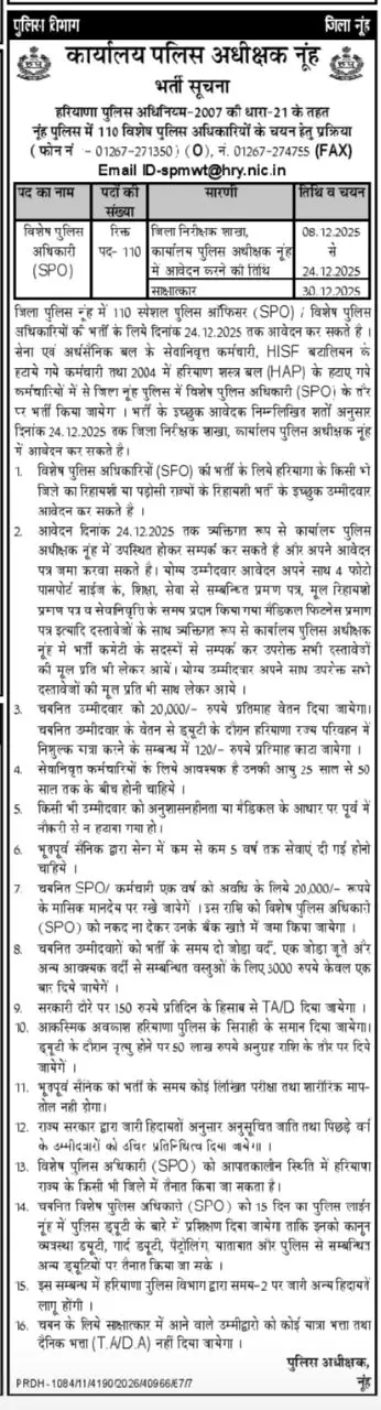 SPO (Special Police Officer)Nuh12th Pass & Ex-Serviceman/ HISF Battalion Employee110