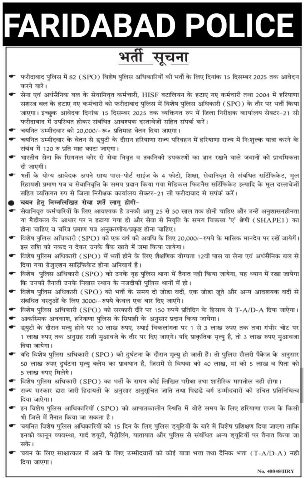 Important Information :- Haryana Police SPO Vacancy : Haryana Police Department, Faridabad & Nuh is Informed or Notify you that Application have been sought for 192 SPO (Special Police Officer) post. The Application Start Date for this form is Check Below District Wise. Last Date of Submission of Form is Check Below District Wise.