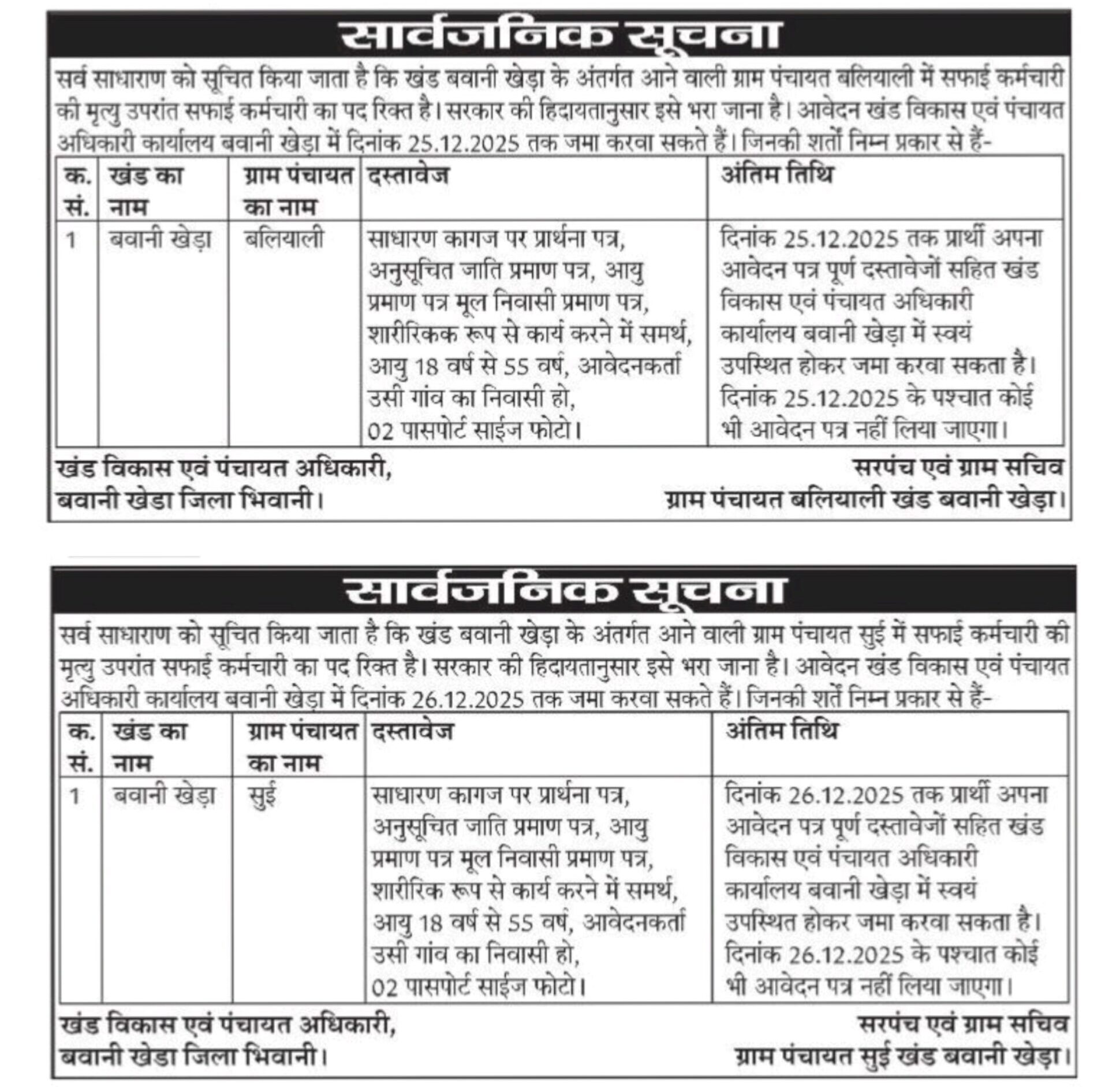 Important Information :- Haryana Safai Karamchari Recruitment : Office of Block Development & Panchayat Officer, (Bwani Khera – Bhiwani) is invited application of Safai Karamchari posts on Contract basis for doing Cleaning in Related Village of Block. The Application Starting Date for all Eligible Candidates is 19.12.2025. The last date for submission of various Vacancy applications is Mention Below. Information Related to this Bharti/Recruitment is Given Below.