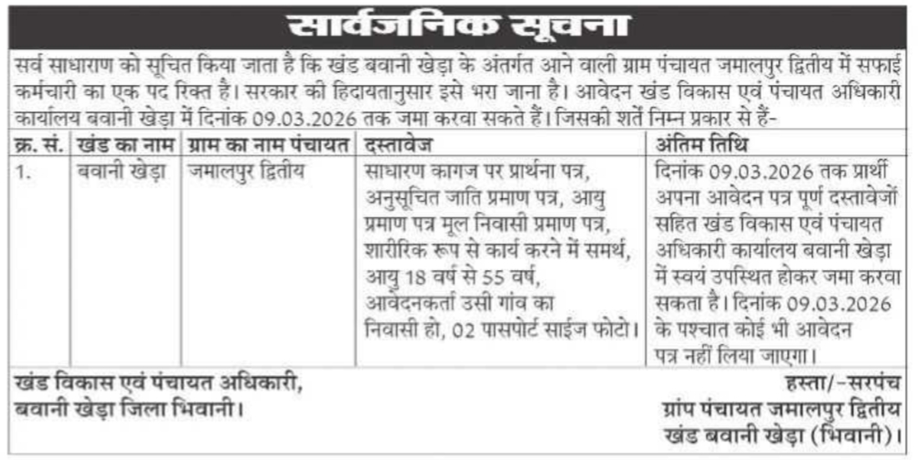 Important Information :- Haryana Safai Karamchari Recruitment : Office of Block Development & Panchayat Officer, (Block-BAWANI KHERA, BHIWANI) Haryana is invited application of Safai Karamchari posts on Contract basis for doing Cleaning in Related Village of Block. The Application Starting Date for all Eligible Candidates is 26.02.2026. The last date for submission of various Vacancy applications is 09.03.2026. Information Related to this Bharti/Recruitment is Given Below.