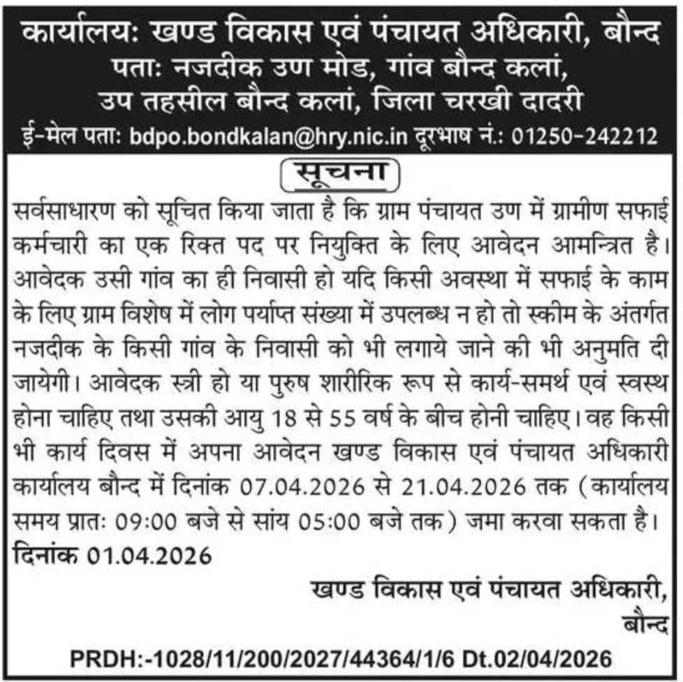 Important Information :- Haryana Safai Karamchari Recruitment : Office of Block Development & Panchayat Officer, (Block-BAUND, CHARKHI DADRI) Haryana is invited application of Safai Karamchari posts on Contract basis for doing Cleaning in Related Village of Block. The Application Starting Date for all Eligible Candidates is 07.04.2026. The last date for submission of various Vacancy applications is 21.04.2026. Information Related to this Bharti/Recruitment is Given Below.