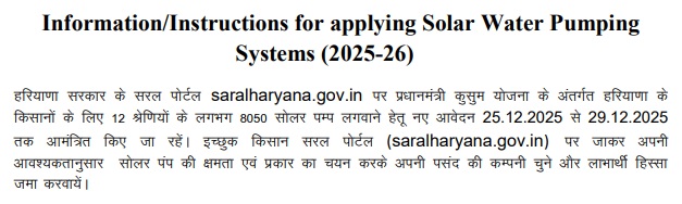 Short Information :- Haryana Solar Water Pumping Scheme : Department of New & Renewable Energy, Haryana invites applications for SOLAR Water Pumping Systems for farmers at 75% subsidized rate. In this Scheme, Interested farmers will have to pay only 25% of the cost. Department of New & Renewable Energy HARYANA has Released a Notification for this Scheme. The Online Application Starting Date for this scheme is 25 December 2025. The last date for submission of this Scheme applications is 29 December 2025. The detailed notification for this Scheme is released by Department. Haryana Solar Water Pumping Scheme