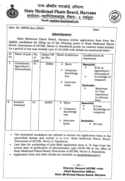 Important Information :- Haryana State Medicinal Plants Board Vacancy : State Medicinal Plants Board, Haryana is Informed or Notify you that Application have been sought for Consultant and Account Assistant posts under Contract Basis. The Application Starting Date for all Eligible Candidates is 29 November 2024. The last date for submission of Vacancy applications is 15 December 2024. Information Related to this Bharti/Recruitment is Given Below. Before Applying for this Recruitment, Candidates must be Checked all Essential & Important Information like as Eligibility, Qualification, Age Limit, Fees, Syllabus, Pervious Year Papers (PYP), Exam Date, Admit Card, Result, Final Merit List etc. All Related Information is Available on this Website or Official Website of Recruitment Organization. Haryana State Medicinal Plants Board Vacancy