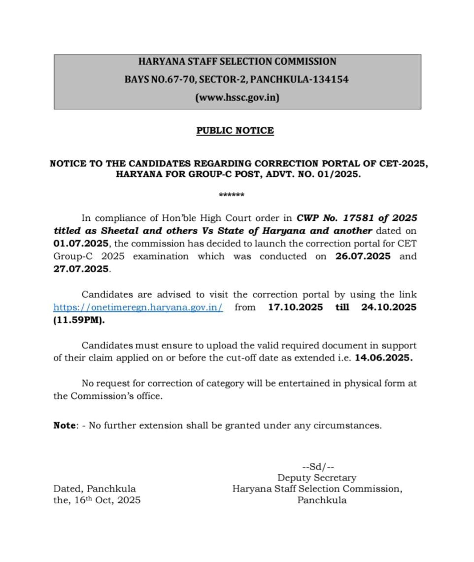 Important Update:- Now HSSC has decided to Start Correction Portal from 17 October 2025. End Date of Correction Portal is 24 October 2025.