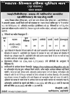 Important Information :- ITBP Assistant Commandant Recruitment : Indo-Tibetan Border Police Force (ITBP) is Informed you that Application have been sought for 06 Posts of Assistant Commandant. The Application Starting Date for all Eligible Candidates is 21.04.2026. The last date for submission of ITBP Vacancy applications is 20.05.2026. As Per Notification of Indo-Tibetan Border Police Force (ITBP) Vacancy 2026, Other Information Related to this Bharti/Recruitment is Given Below.