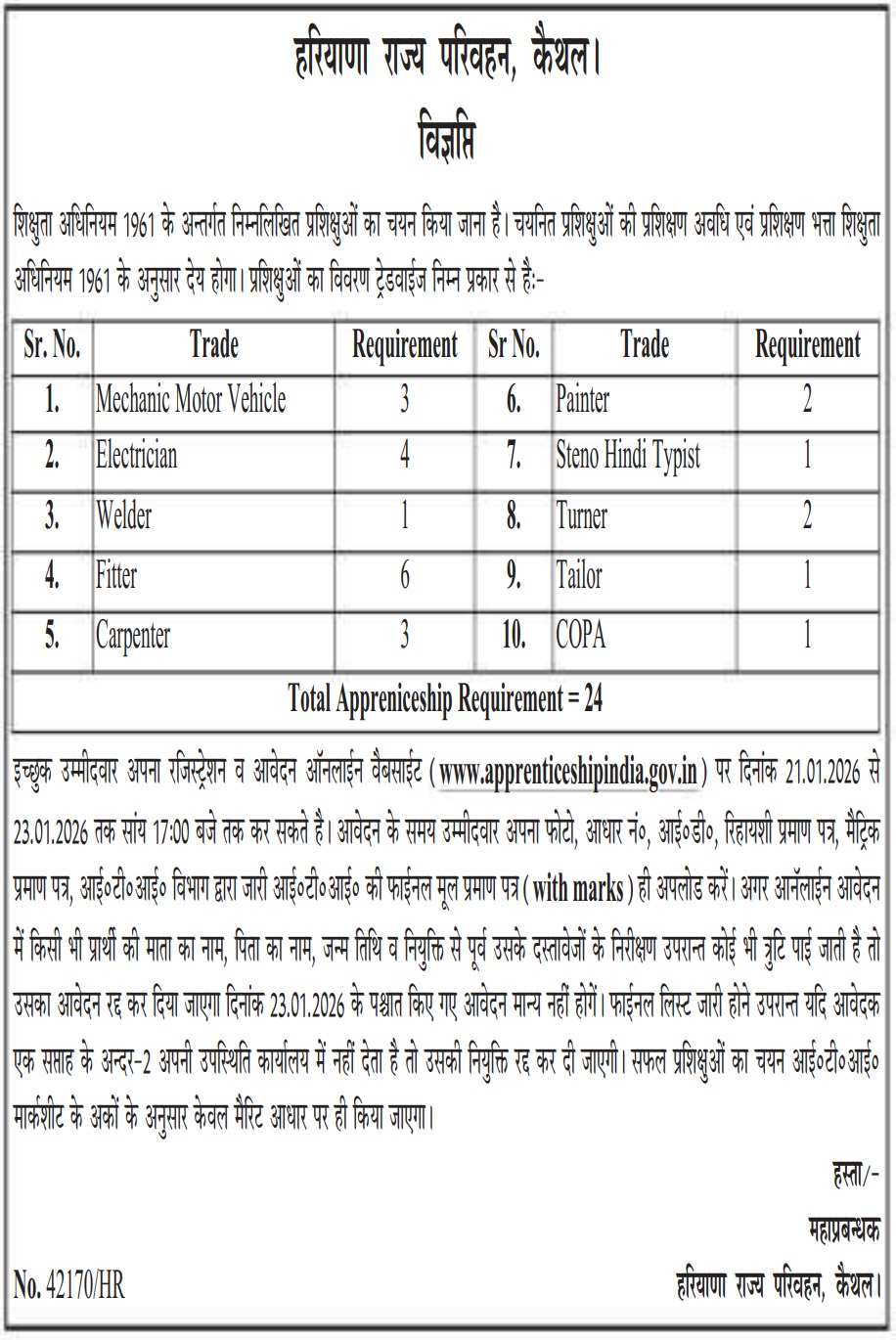 Important Information :- Kaithal Roadways Recruitment 2026 : Ministry of Skill Development And Entrepreneurship is Informed or Notify you that Application have been sought for Various posts under Apprenticeship. The Application Starting Date for all Eligible Candidates is 21 January 2026. The last date for submission of various Vacancy applications is 23 January 2026. Information Related to this Bharti/Recruitment is Given Below.