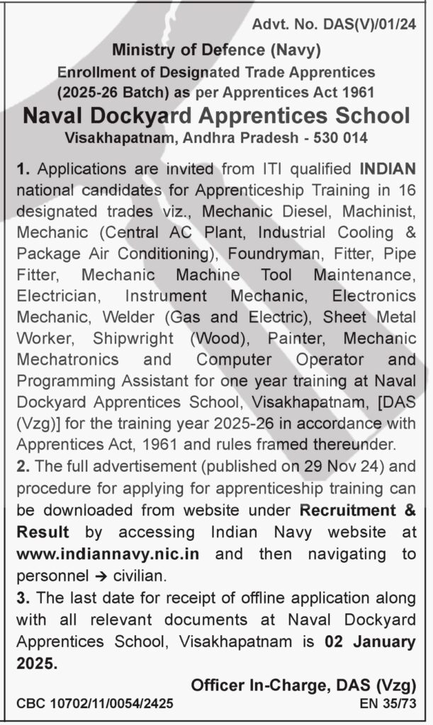 - Send Application : The Officer-in-Charge (for Apprenticeship), Naval Dockyard Apprentices School, VM Naval Base S.O., P.O., Visakhapatnam – 530 014, Andhra Pradesh” by Post so as to reach at DAS (V) by 02/01/2025