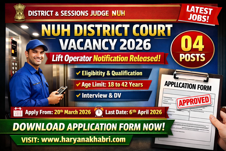 Important Information :- NUH District Court Vacancy 2026 : OFFICE OF THE DISTRICT & SESSIONS JUDGE, NUH is Informed or Notify you that Application have been sought for 04 Posts of Lift Operator on Ad-hoc Basis for the financial year 2026-27. The Application Starting Date for all Eligible Candidates is 20.03.2026. The last date for submission of Court Vacancy applications is 06.04.2026.