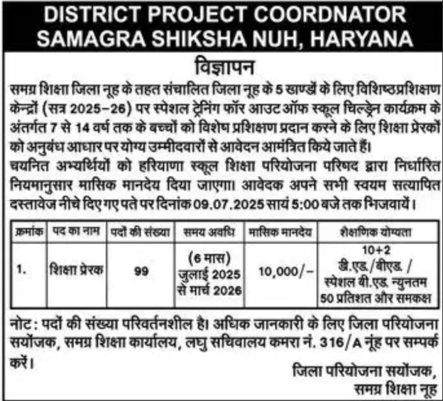 Important Information :- NUH Education Volunteer Recruitment 2025 : (Haryana School Shiksha Pariyojna Parishad Panchkula) District Project Coordinator, Samagra Shiksha Abhiyan NUH, Haryana is Informed or Notify you that Application have been sought for 99 post of Education Volunteers in NUH district. The Application Starting Date for all Eligible Candidates is 03 JULY 2025. The last date for submission of this Vacancy applications is 09 July 2025. Information Related to this Bharti/Recruitment is Given Below.