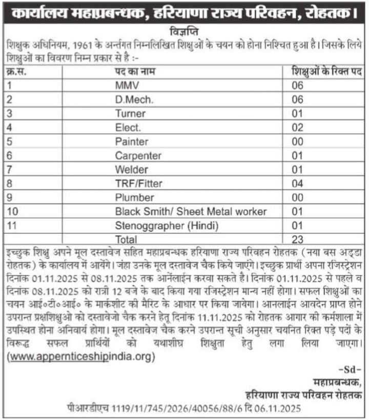 Important Information :- Rohtak Haryana Roadways Recruitment : Ministry of Skill Development And Entrepreneurship is Informed or Notify you that Application have been sought for Various posts under Apprenticeship. The Application Starting Date for all Eligible Candidates is 01.11.2025. The last date for submission of various Vacancy applications is 08.11.2025. Information Related to this Bharti/Recruitment is Given Below.