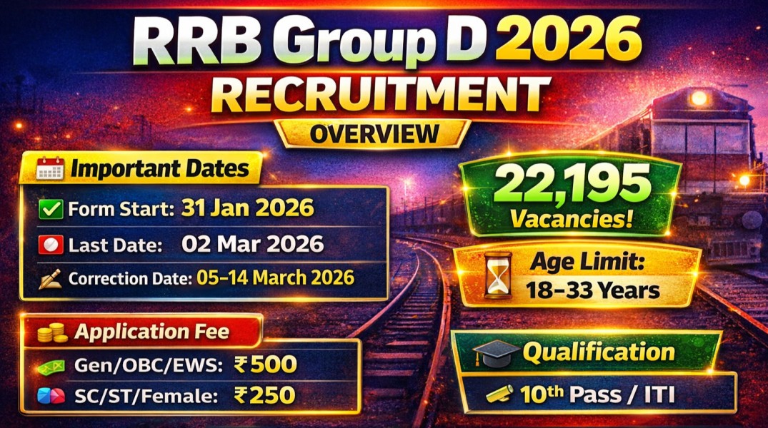 Important Information :- RRB Group D Recruitment 2026 : Railway Recruitment Board (RRB), Ministry of Railways, Government of India is Informed or Notify you that Application have been sought for 22195 Group D Various Post. The Application Starting Date for all Eligible Candidates is 31 January 2026. The last date for submission of Group D Vacancy applications is 02 March 2026.